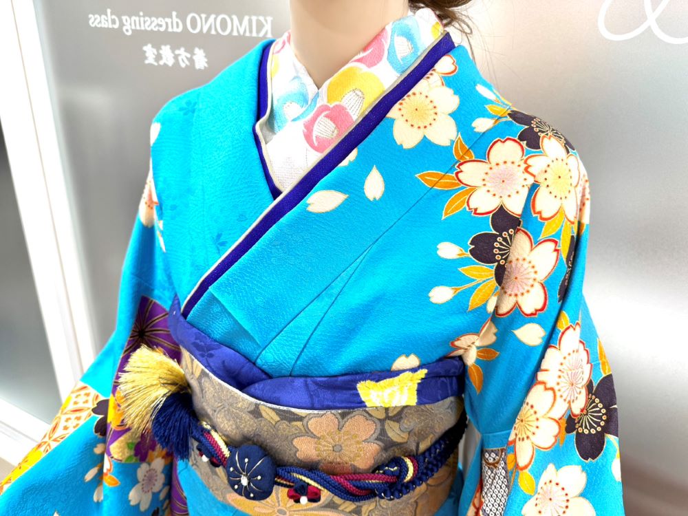 重ね衿: 振袖よりも深い色の青 を入れることにより、