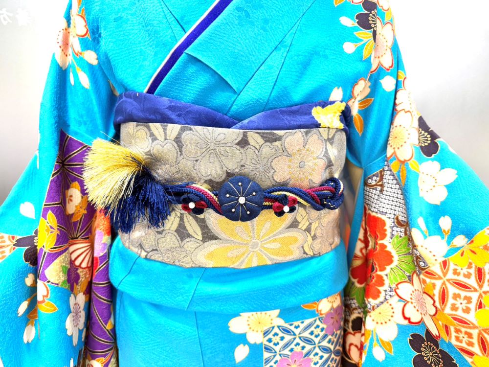 帯締め: こちらも深い青 を使用し、小物の色を統一しています。