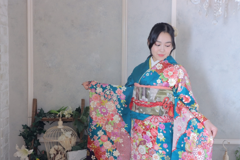 振袖の柄に使われている色から、いくつかキーカラーを選び、小物の色味をそこに合わせると統一感が出ます。例えば、振袖の柄にピンクと緑が使われていれば、帯締めはピンク、帯揚げは緑といった具合です。 -