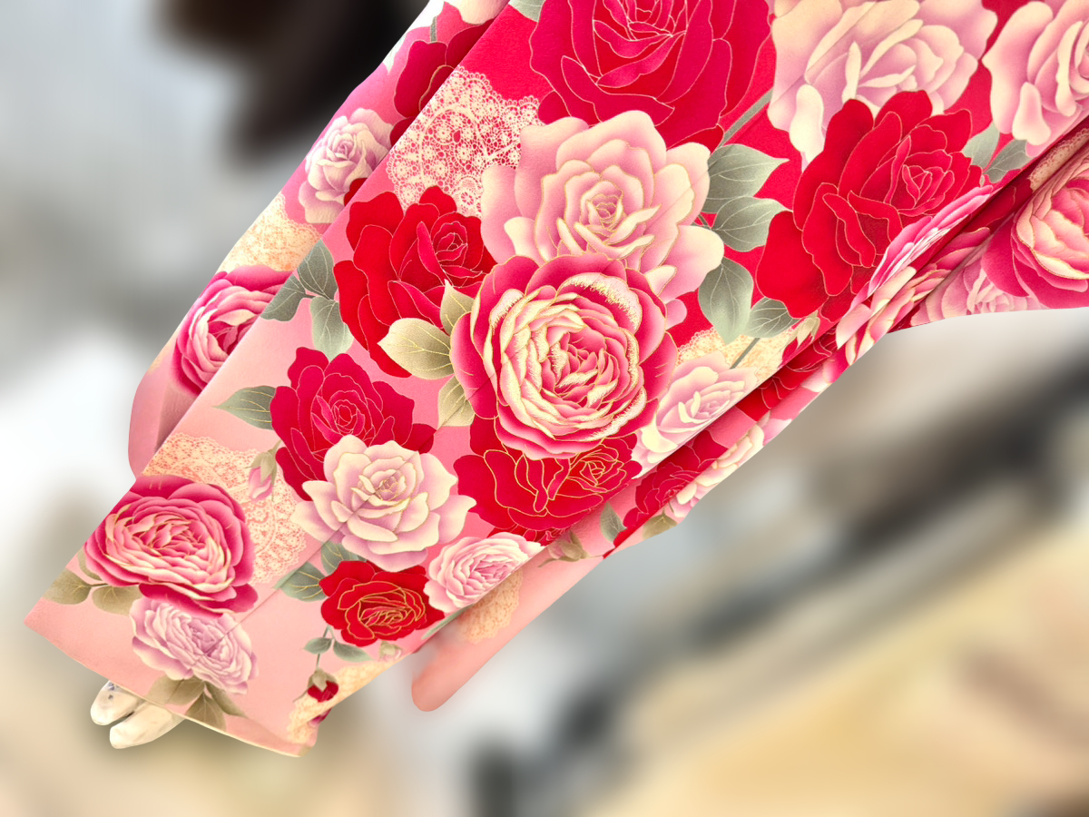 まず目を引くのは、赤からピンクまでのグラデーションで描かれたバラの柄。 華やかでありながら優しさや気品も感じられ、 まとうだけで明るく女性らしい雰囲気が広がります。