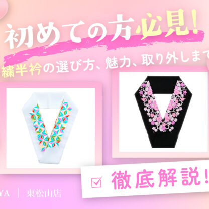 半襟とは、文字通りお振袖の中に着る長襦袢の襟に縫い付けて使います。その長襦袢の襟が見えるようにお振袖を着るので画像にあるように半襟に柄があることでよりオシャレになるんです!