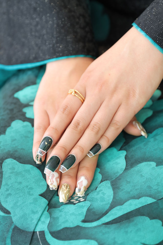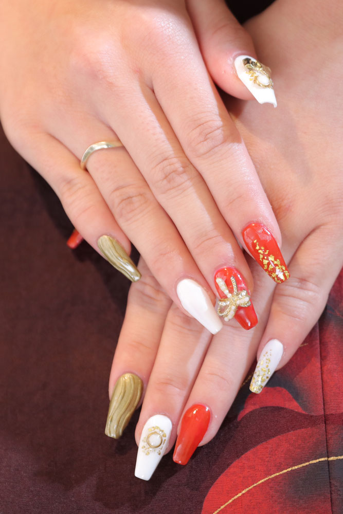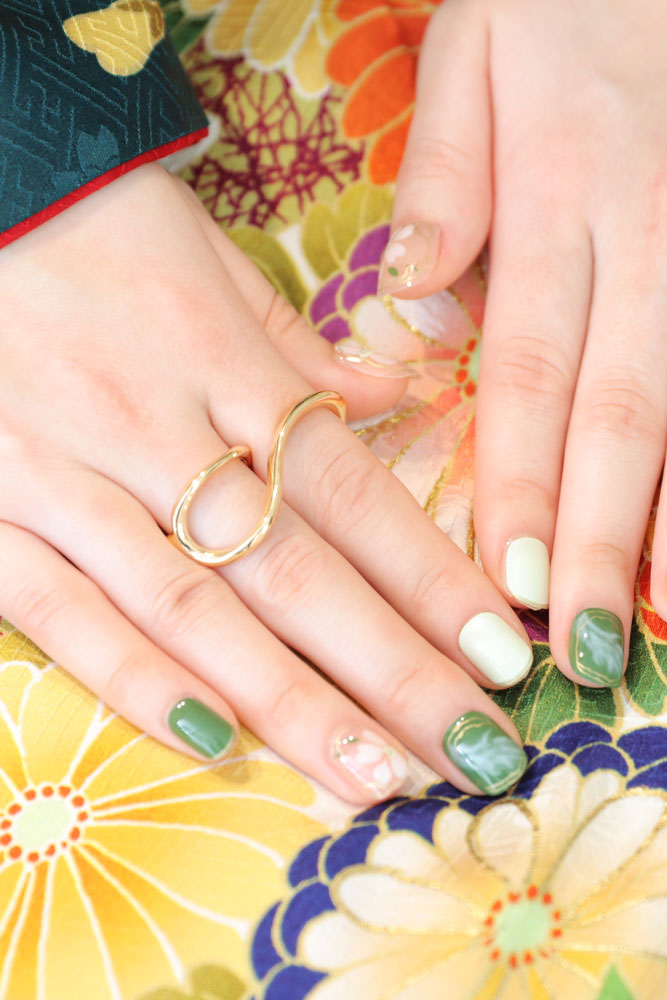 振袖のネイルの場合は、普段のネイルとは違い和柄のモチーフや、縁取りの花柄のモチーフ、金銀のパーツを使ってみると、和装の雰囲気が出ておすすめです!