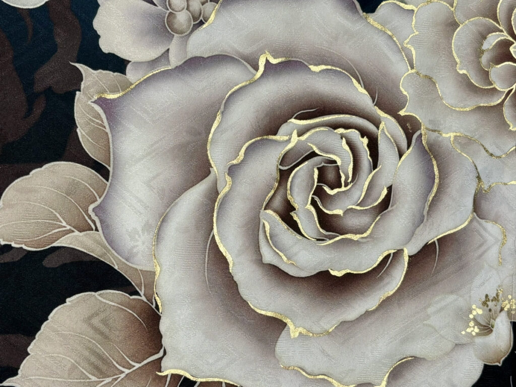 現代的なおしゃれ感: 古典的な振袖の柄にモダンな印象を加える要素としても、薔薇は人気があります。伝統的な装いの中に、現代的なセンスや個性を表現したいという思いが込められています。