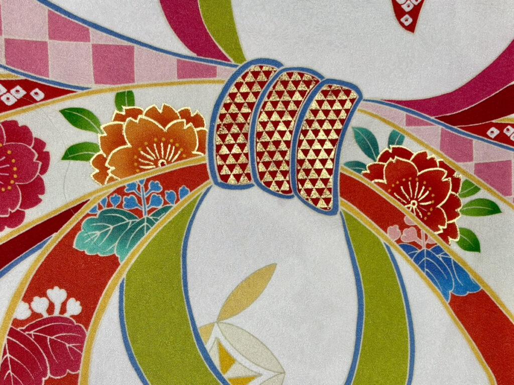 人と人との繋がり: 熨斗が幾重にも重なるデザインや、他の吉祥文様と組み合わされることで、人と人との繋がりや絆を深めるという意味合いが込められることがあります。成人を迎え、新たな人間関係を築いていく女性への祝福と、末永い良好な関係を願う気持ちが表現されています。