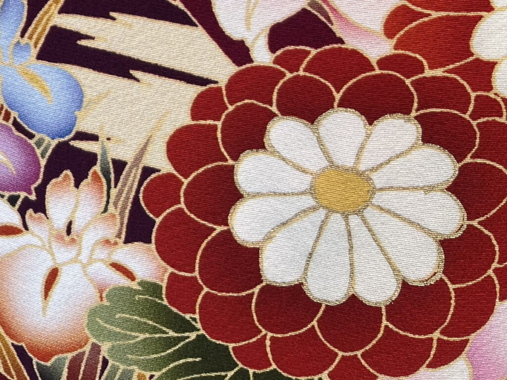 長寿と健康の象徴: 菊は古来より中国で不老長寿の薬とされ、日本でも延命長寿の象徴として尊ばれてきました。振袖に描かれた菊柄は、持ち主の健康と幸福な長寿への願いが込められています。特に、成人という人生の大きな節目を迎える女性にとって、 これからの健康や幸せを祈る意味合いが強く込められることが多いです。