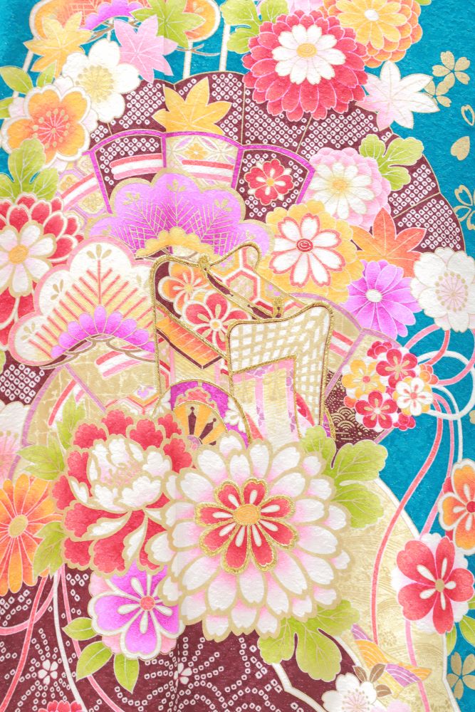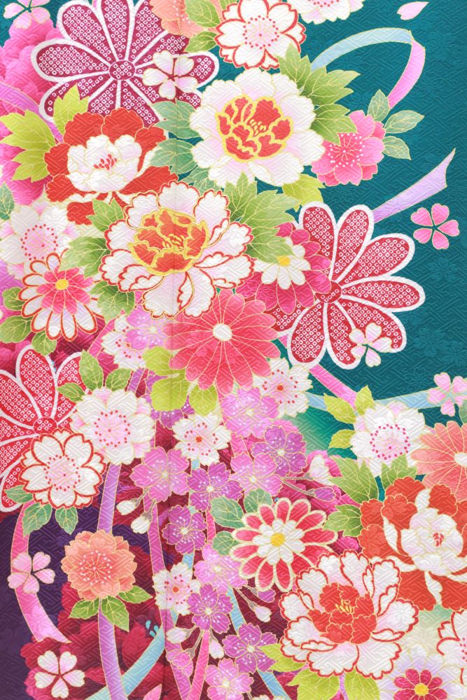 鮮やかな青緑を基調とし、ピンク、赤、白、黒など多色の花柄が全体に華やかに散りばめられています!
