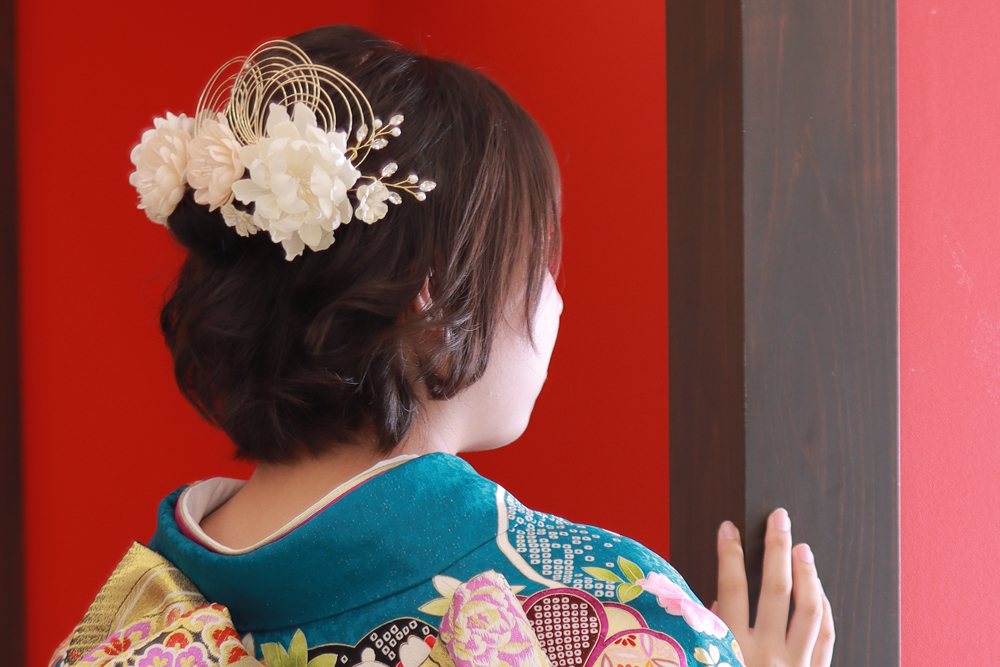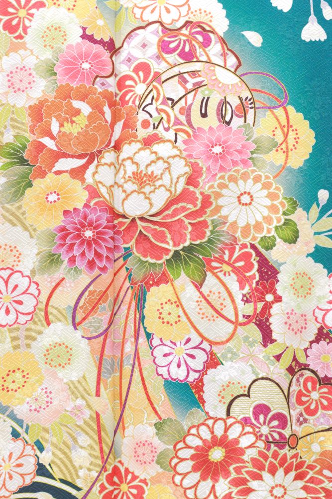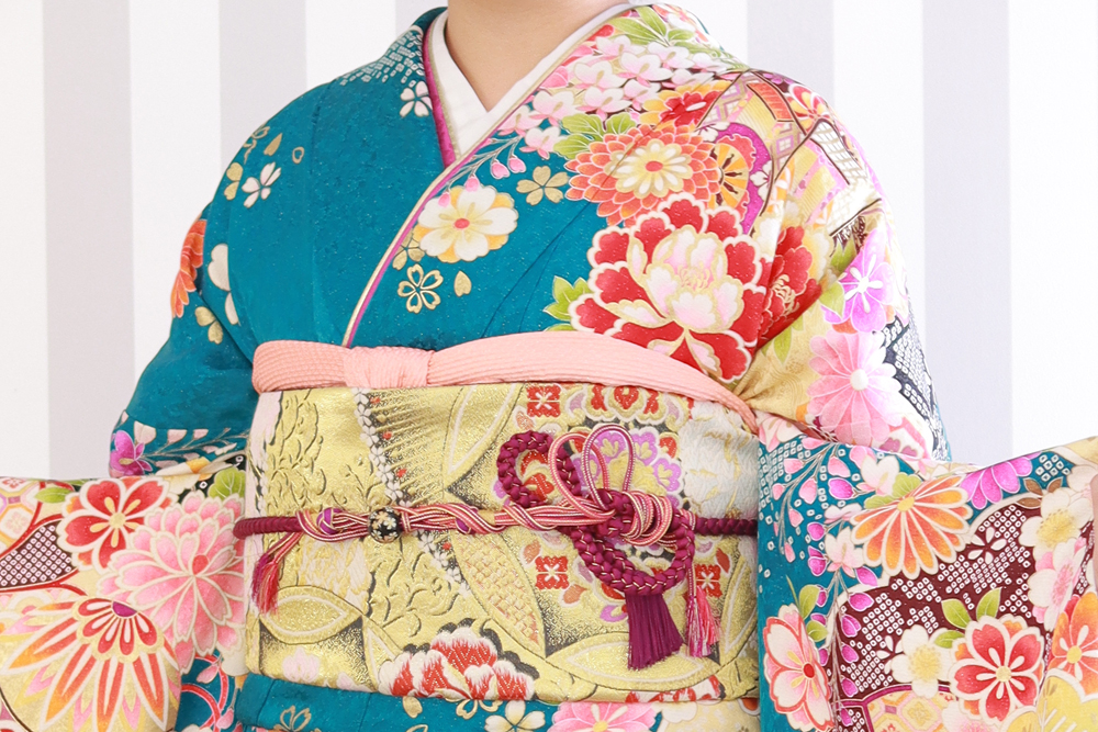 また、鮮やかな青緑の振袖に負けず、はっきりとした色なので目立ちますね♪