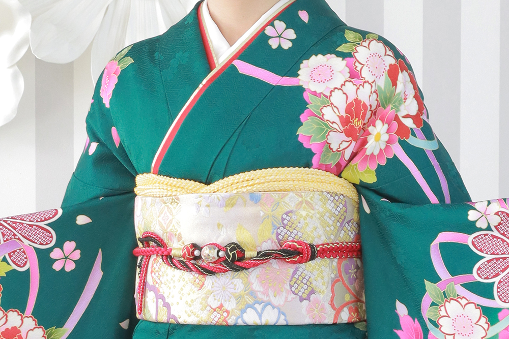 振袖の深い緑色と鮮やかな花柄を優しく受け止めつつ、明るい色合いでコーディネート全体に軽やかさを加えています。金色の模様は、華やかさをプラスする役割も果たしていますね(*˘︶˘*).。.:*♡