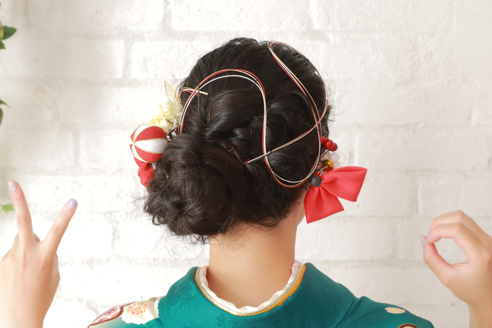 髪飾りは、左右に大きな飾りを使い、後ろには赤や白の水引を組み合わせてアレンジされています♪