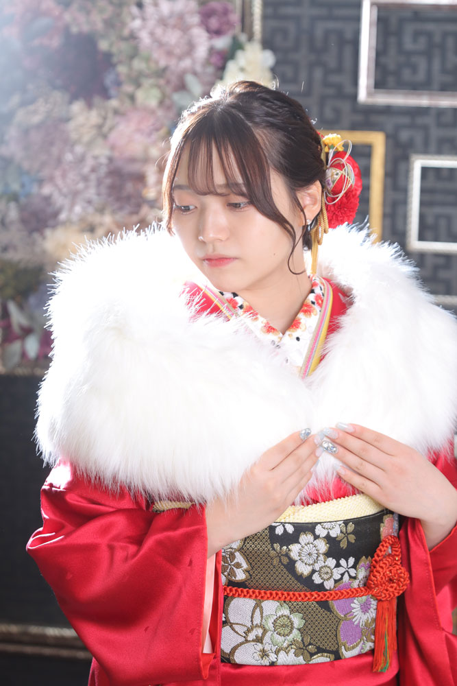 普段前髪を下ろしている方が、前髪を上げるとガラッと雰囲気が変わって、振袖の特別感が出ます!