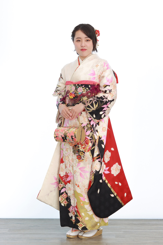 こちらの振袖は、オフホワイトをベースに、裾にかけて大胆な黒と赤の切り替えが入っているのが特徴的なデザインですね☆