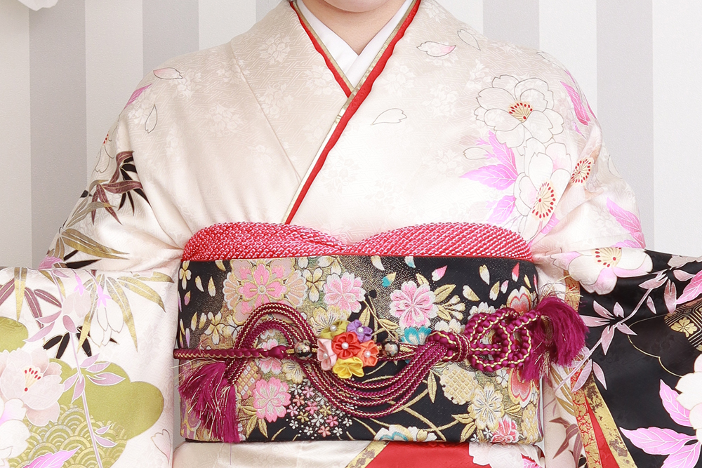 黒地に、ピンクや白、金色の花柄が華やかに織り込まれた帯が締められています。
