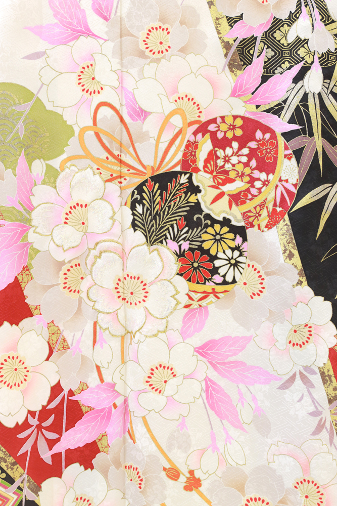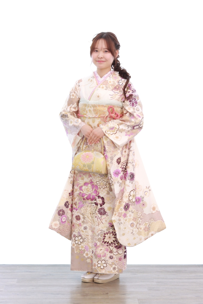 こちらの振袖は、淡い生成り色をベースに、ピンクや紫、金色の様々な花柄が全体に華やかに散りばめられた、とても優美なデザインですね♪