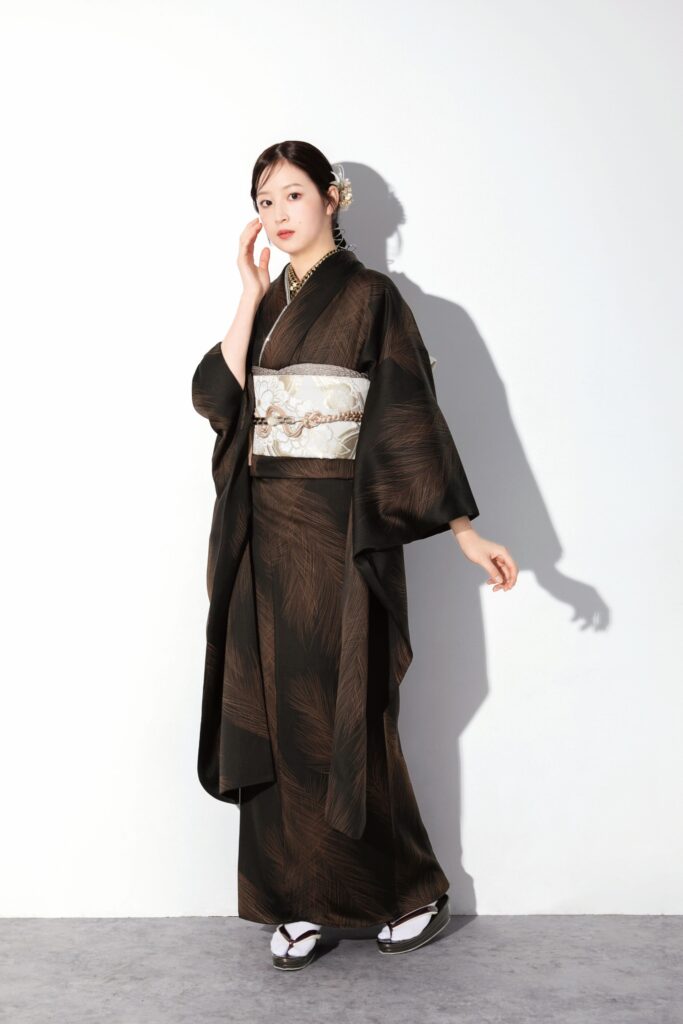 白×黒のシンプルな色味に、インパクトのある柄や大ぶりな帯結びで魅せるスタイルは、まさに“都会派”!小物をすべて黒で統一して“攻めの美しさ”を演出したり、差し色で赤やシルバーを入れても◎。