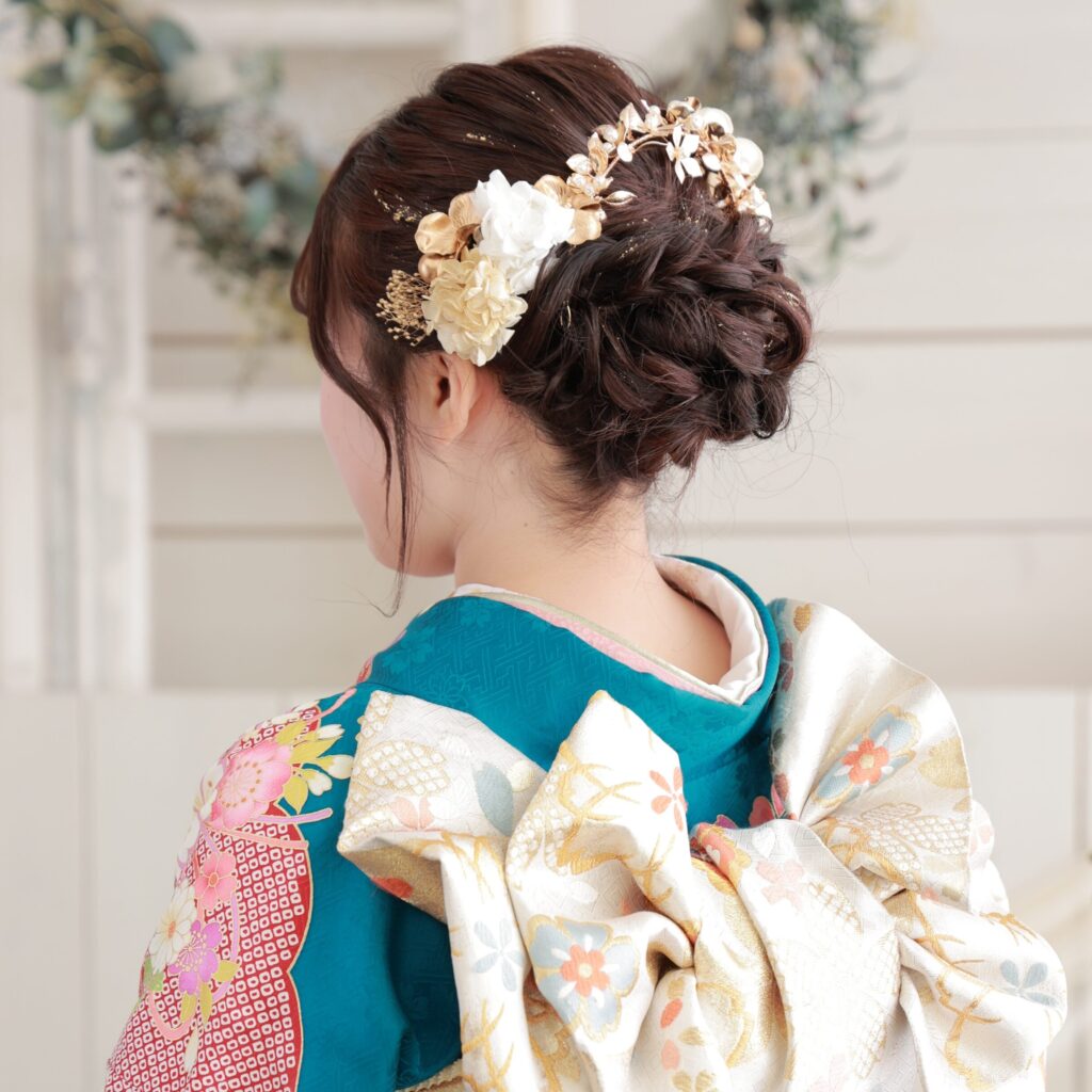振袖姿は、ヘアスタイルと髪飾りで大きく印象が変わります。古典的なアップスタイルも素敵ですが、ゆるふわな編み込みヘアや、ローポニー、水引や金箔を使ったモダンなヘアアレンジも人気です。髪飾りも、生花やドライフラワー、かすみ草、パールピンなど、洋装のヘッドドレスのような感覚で選ぶと、より洗練された印象になります。ママ振袖の雰囲気に合わせて、和と洋をミックスさせたコーディネートを試してみてはいかがでしょうか。
