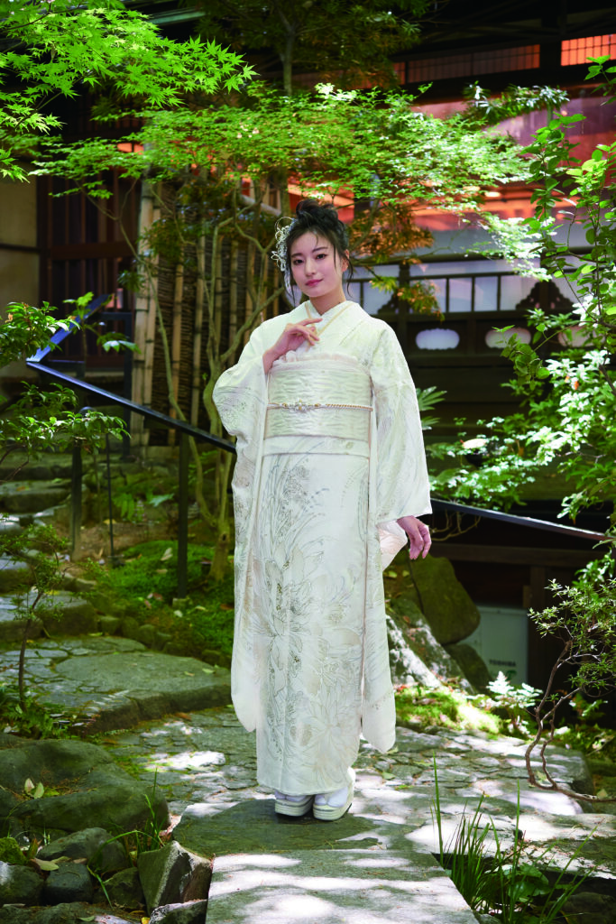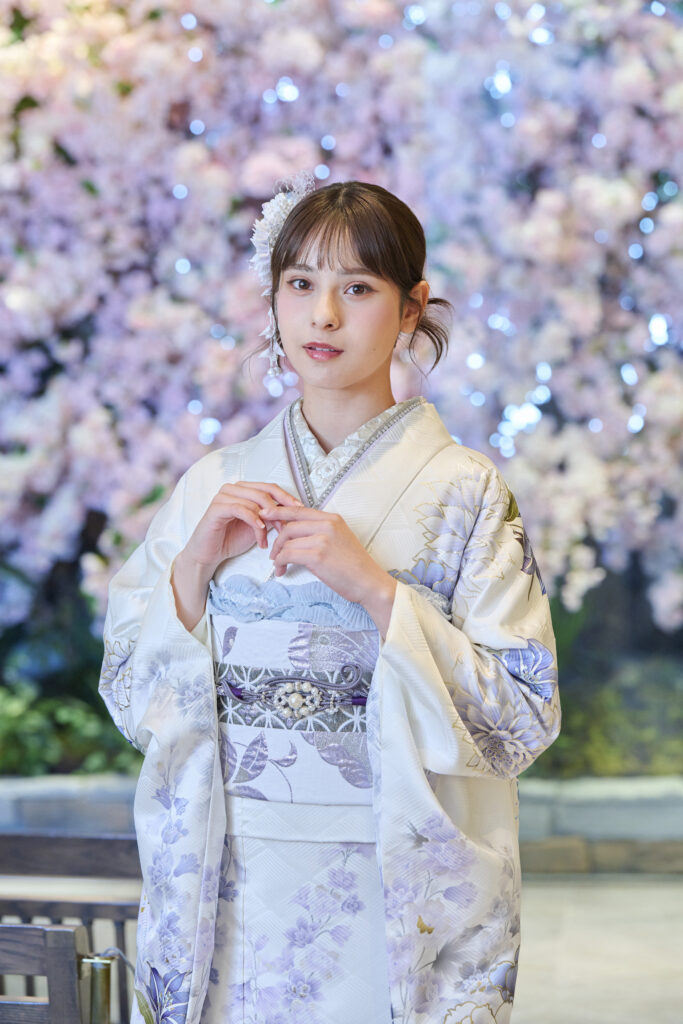 柄物振袖は、柄の色やテーマに小物を合わせる必要がありますが、シンプル振袖はまるで真っ白なキャンバス のように、合わせる帯や小物の色・柄を自由に選べます。洋装のアクセサリーや個性的なアイテムも馴染みやすいのが強みです。