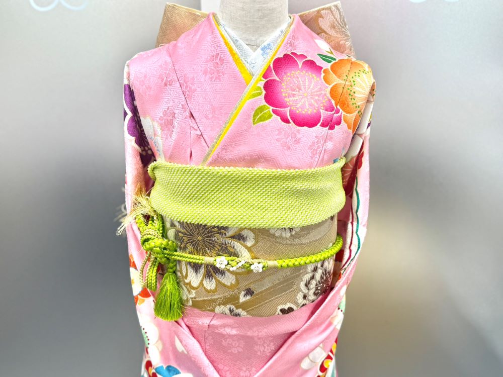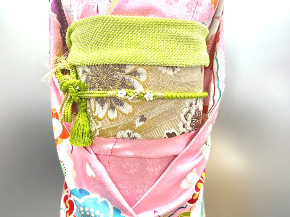 帯揚げには、若草色を使用。 やわらかなグリーンが加わることで、 ピンクを基調とした振袖の甘さを程よく抑え、 爽やかで洗練された印象に仕上がっています。 全体の色バランスを整える、重要なアクセントカラーです。
