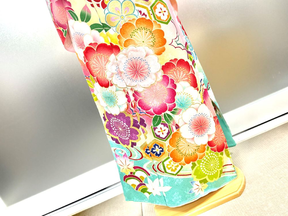 赤やピンクを基調とした色彩の中に、市松や扇といった伝統文様が組み合わされることで、 古典柄の華やぎと現代的な可愛らしさが美しく融合。 裾まで大きく描かれた花々は、歩くたびに存在感を放ち、 写真映えも抜群の一着です。