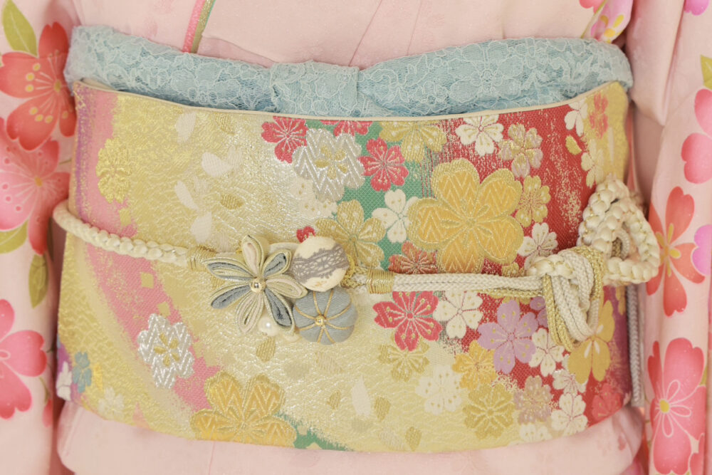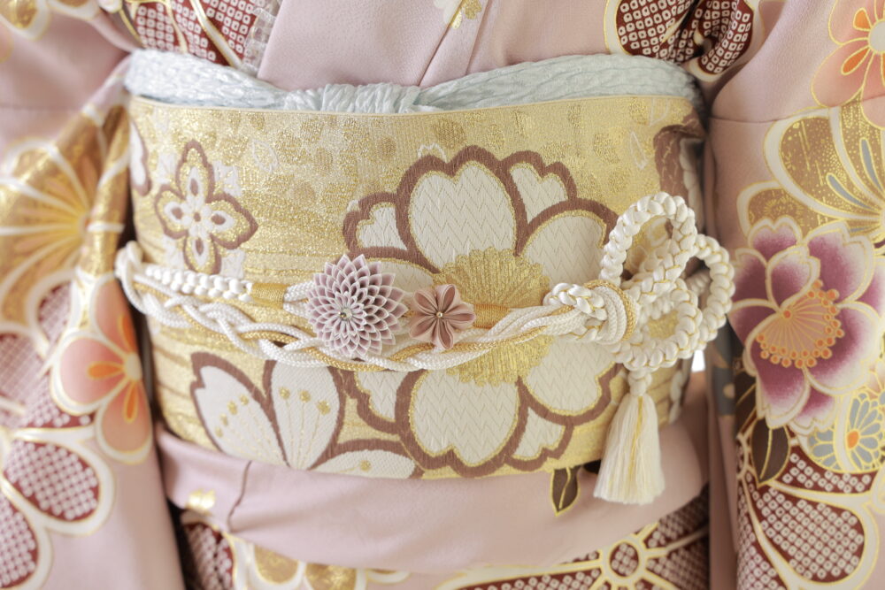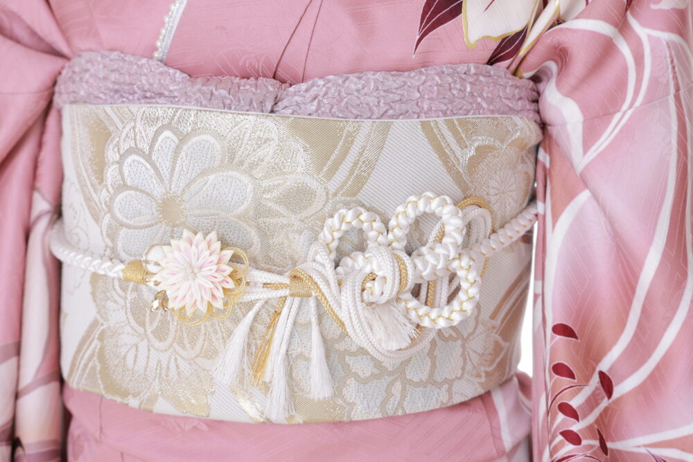 最近はボリュームのある帯締めも人気。豪華な印象になり振袖コーデが一気に華やかになります。