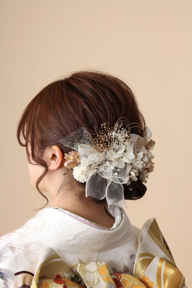 ・当日用: 遠目から見ても存在感がある大ぶりなものや、動き回っても型崩れしにくい水引・リボン。 同じ髪飾りを使い回す場合でも、前撮りでは左側に、当日では右側に配置を変えるだけで、写真の印象は大きく変わります。