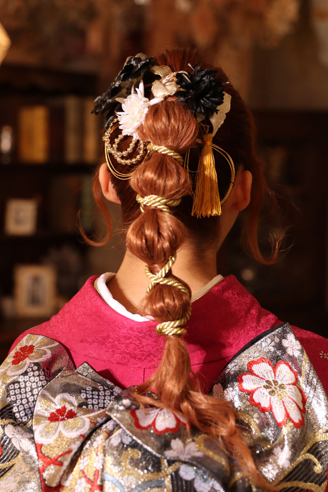 当日:高めポニーテール(タイト&ロング) 当日は一転、頭の高い位置でキュッと結んだポニーテールスタイル。毛先を「玉ねぎアレンジ」にしたり、金箔や長めの紐を巻き付けたりして、縦のラインを強調します。歩くたびに揺れるポニーテールは、式典会場で遠くから見てもパッと目を引く、アクティブで凛としたカッコよさを演出できます。