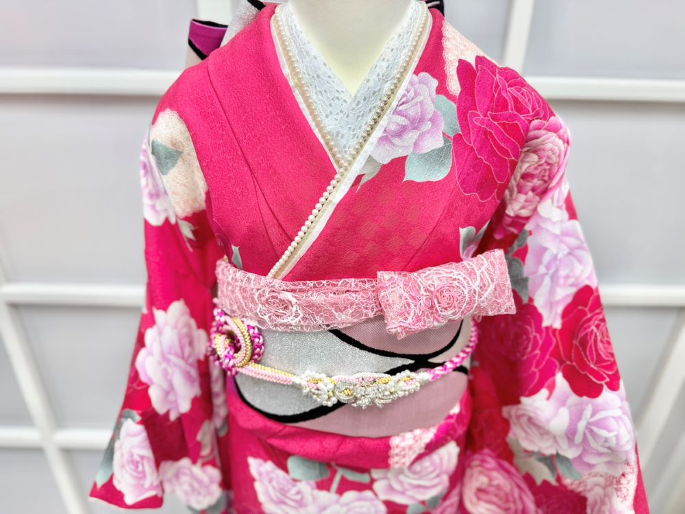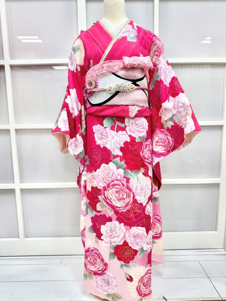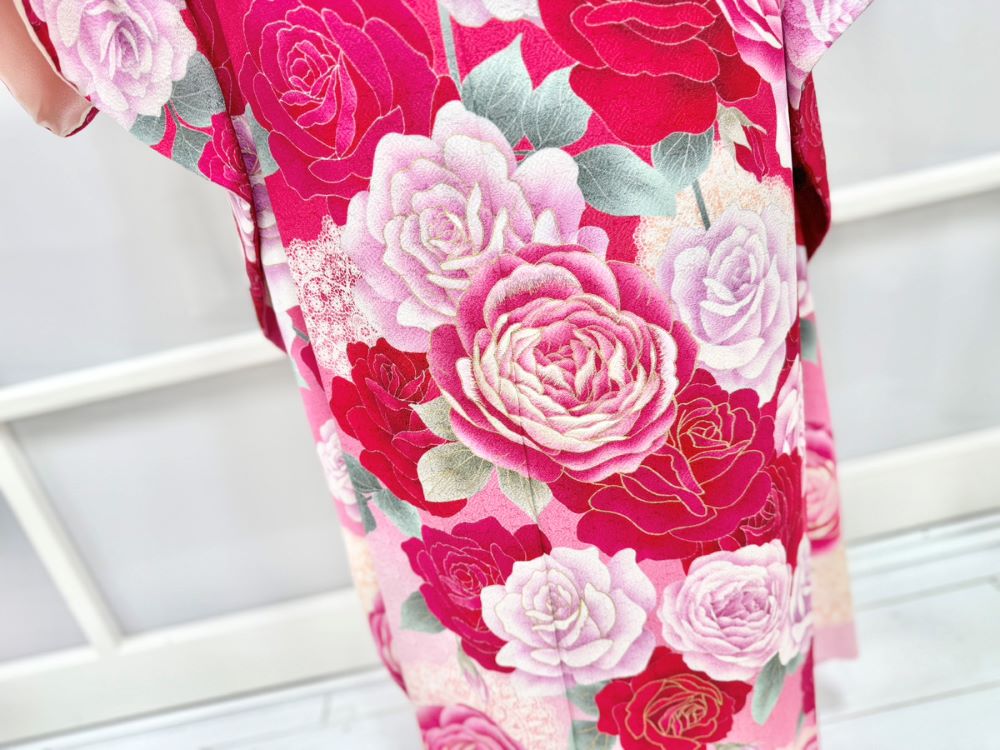 こちらの振袖は、鮮やかなピンクを基調とし、大輪の薔薇が美しく咲き誇るデザインが特徴です。深紅や淡いピンク、白のグラデーションで描かれた薔薇が、まるで一面の花園のように華やかさを演出しています。
