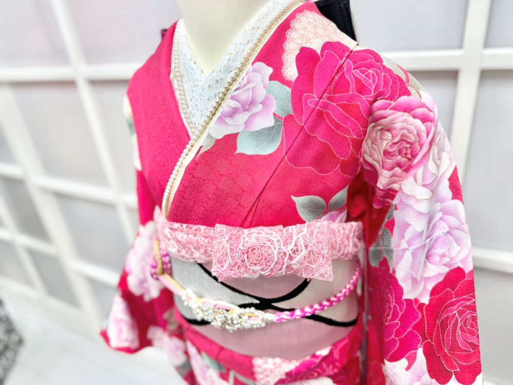 また、襟元や帯には繊細なレースやビジューがあしらわれており、上品なエレガンスをプラス。帯に入っている黒のラインが全体を引き締め、可愛らしさの中に洗練された大人の雰囲気を感じさせます。