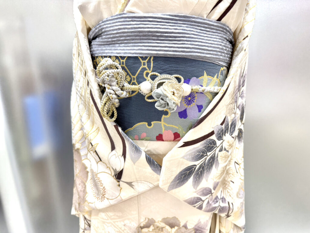 全体の印象をきりっと引き締めるのは、アースカラーの組紐に、くすみブルーのモダンな飾りがあしらわれた帯締め。洗練されたデザインが、古典的な振袖に現代的なスパイスを加え、センスの良さを際立たせます。中央の飾りが素敵なアクセントになっています。