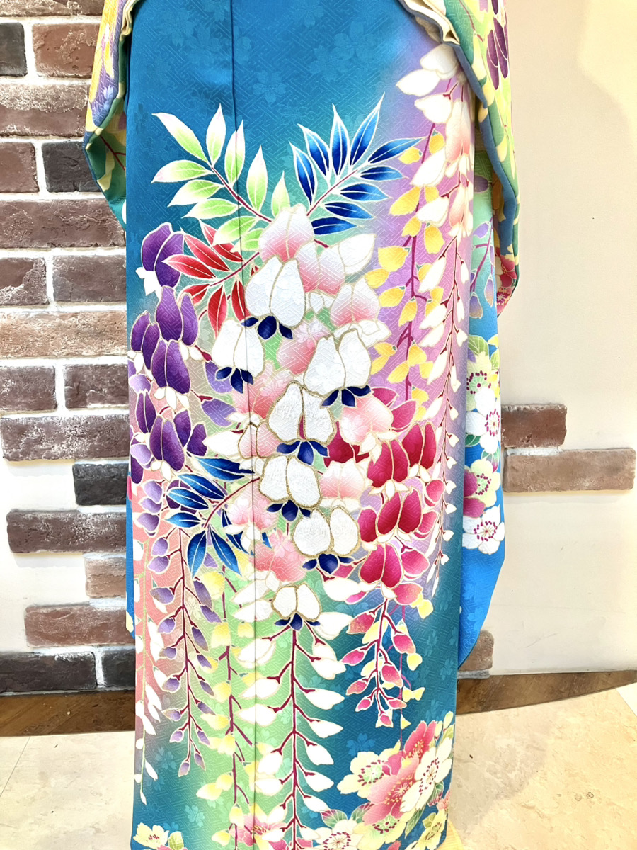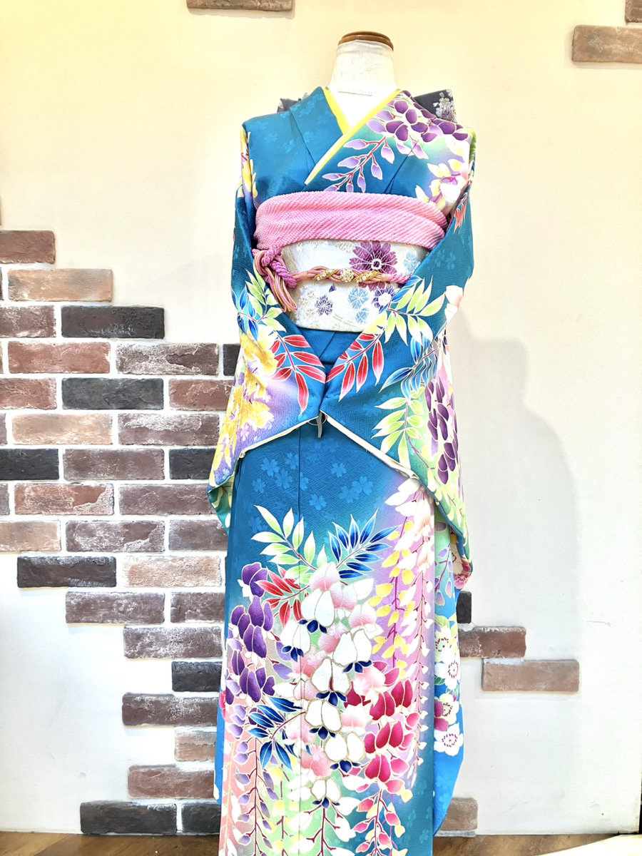 💠気品と個性が際立つ、青緑地の藤柄振袖