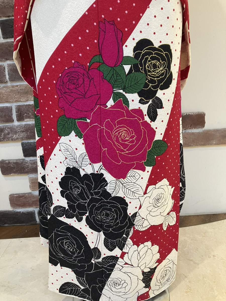 斜めに入った白地の切り替えが全体をすっきり見せ、 そこに大胆に描かれた薔薇が存在感を放ちます🌹