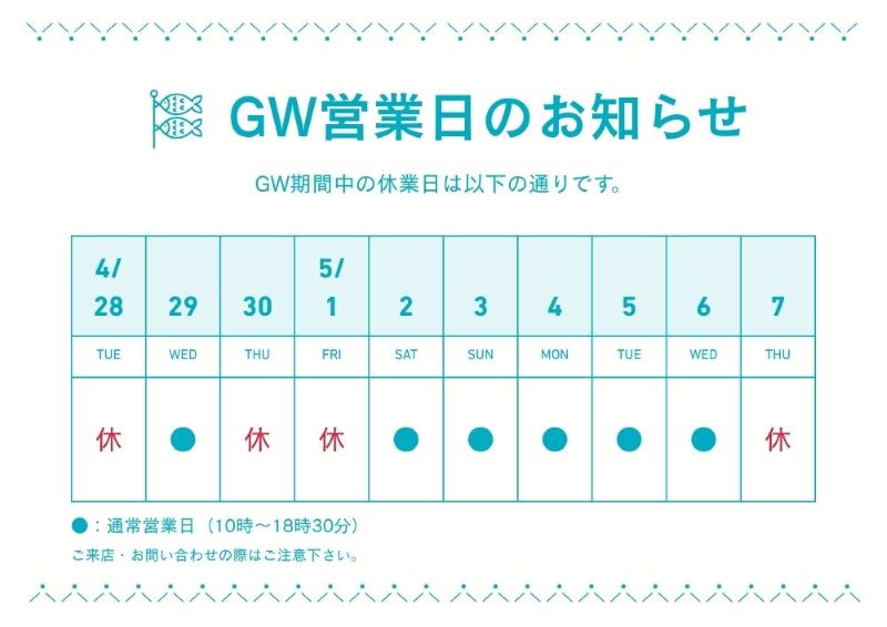4月およびゴールデンウィーク期間中の営業日につきまして、下記の通り営業日を変更させていただきます。お客様にはご不便をおかけいたしますが、何卒ご理解のほどお願い申し上げます。