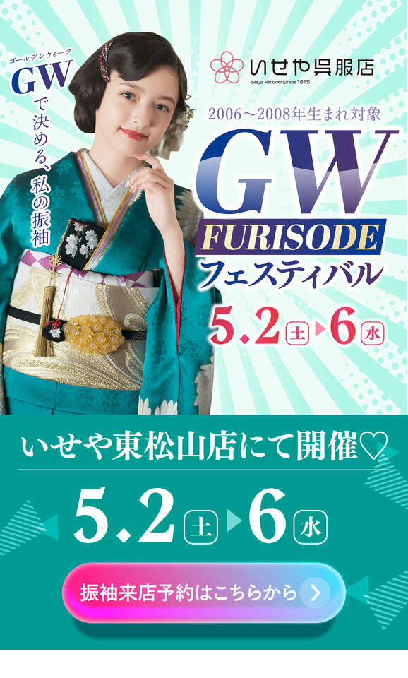5/2-6 いせや東松山店「GW FURISODE フェスティバル」開催 投稿日 2026年4月27日 著者 小沼 カテゴリー ブログ 振袖全品オーダーレンタルOK!自分サイズにピッタリお仕立て♪ PrevNext いせや東松山店 TEL.0493-59-9371 〒355-0017 埼玉県東松山市松葉町3-15-13営業時間:10:00~18:30定休日:毎週火曜・水曜