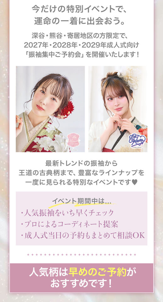 4/16-25 深谷本店「深谷・熊谷・寄居地区限定 振袖集中ご予約会」開催