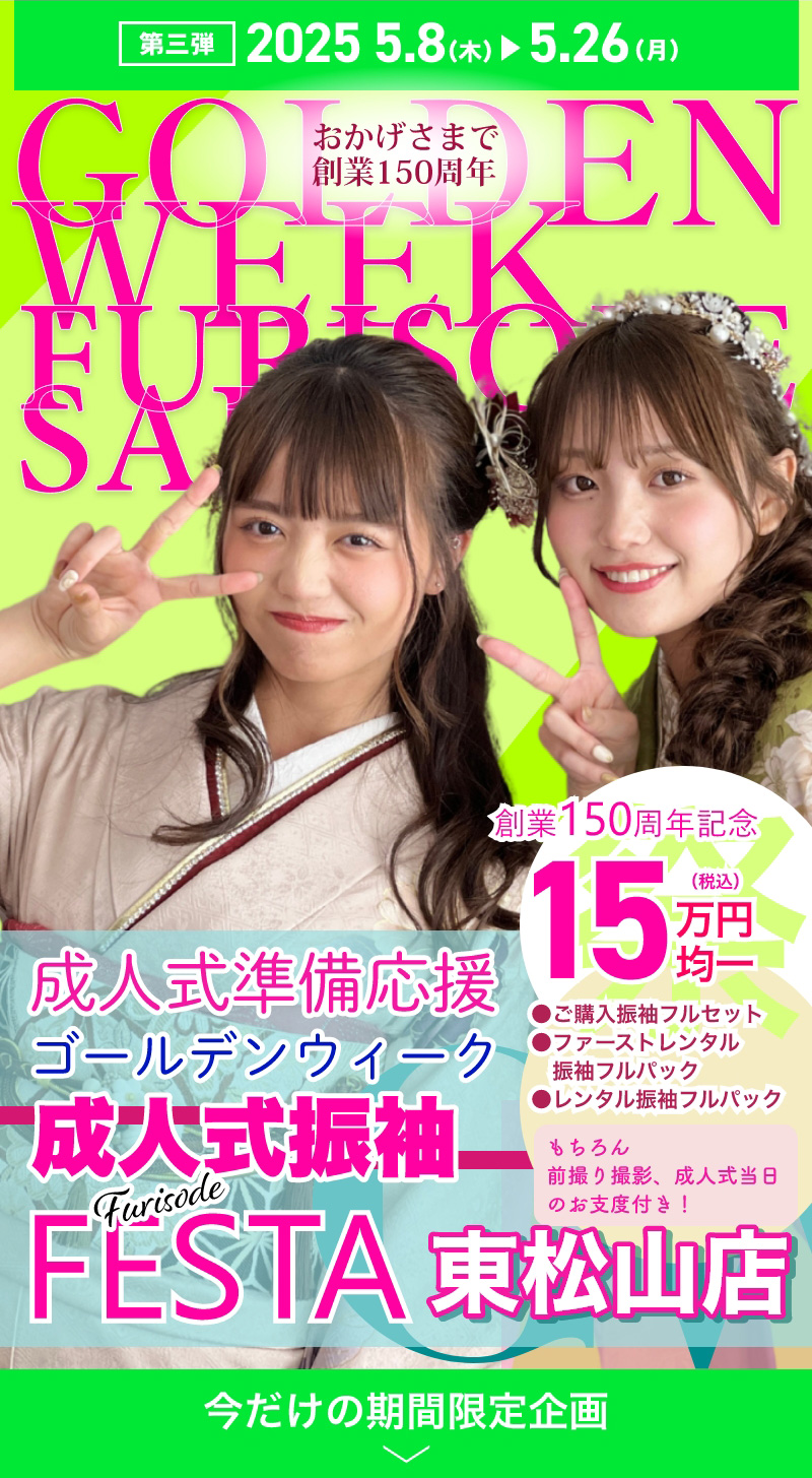 きものいせや Komachi 【東松山店】成人式準備応援ゴールデンウィーク成人式振袖FESTA 【住所】〒355-0017 埼玉県東松山市松葉町3-15-13 【営業時間】10:00~18:30 【定休日】毎週火曜・水曜 HPの予約ページに移動します
