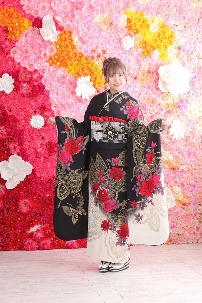 刺繍半衿も黒色にすることで、統一感が出ています!