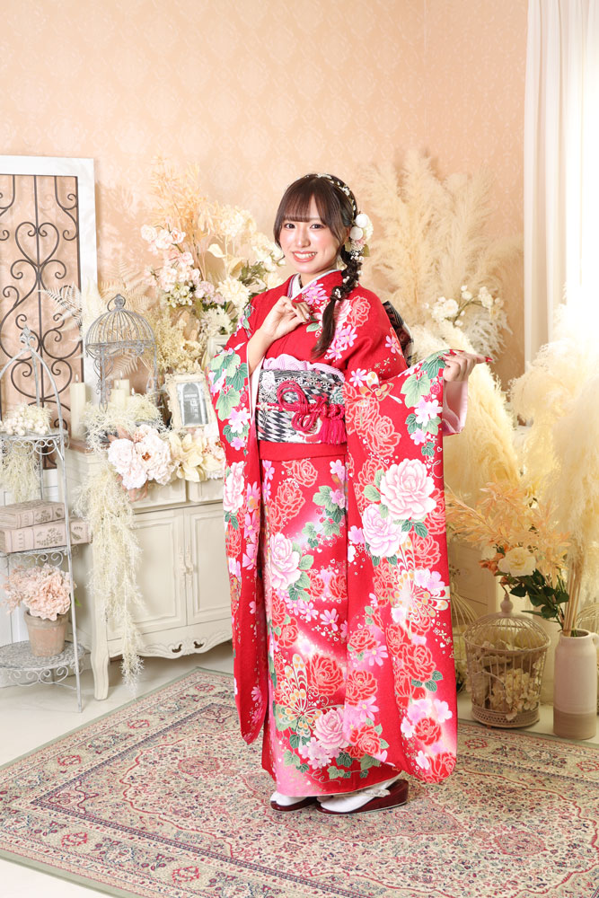 赤色の振袖に華やかな柄が多くあしらわれています。