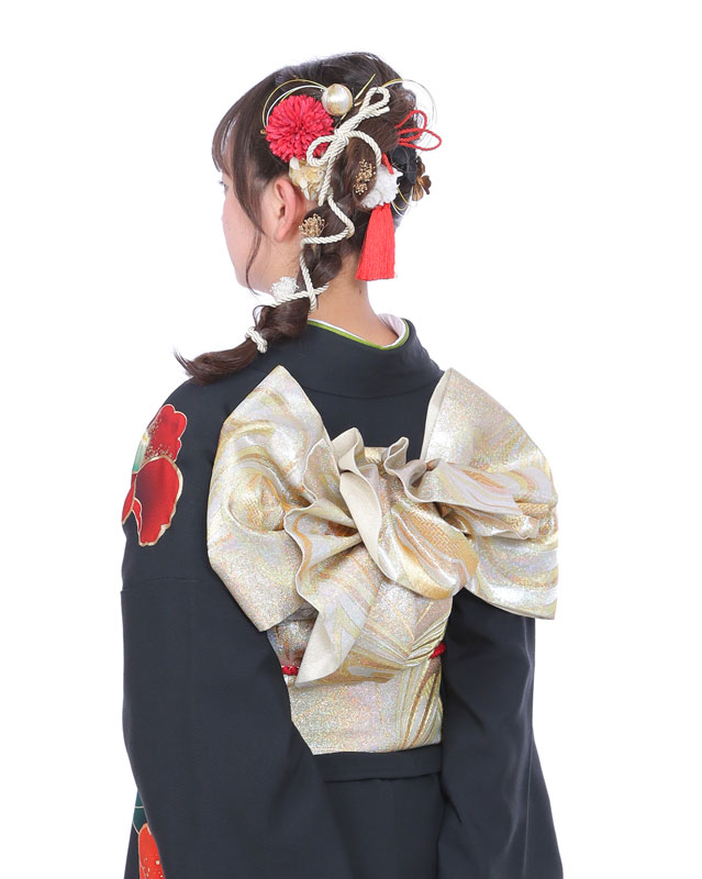 振袖は、格式高い装いのため、着付けも本格的です。肌襦袢、長襦袢、伊達締め、帯板、帯枕、帯揚げ、帯締め、草履、足袋など、多くの小物が必要となり、専門の着付け師による着付けが一般的です。帯結びも、華やかで立体的な「変わり結び」が施され、後ろ姿も芸術的です。