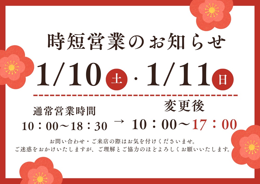 1月10日(土)・11日(日)の営業時間変更のお知らせ @東松山店