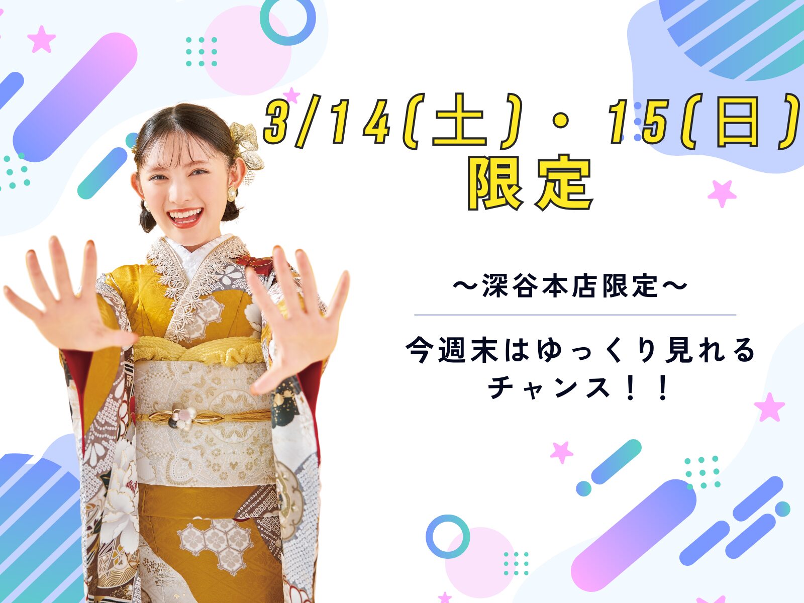 【3/14・15限定】今週末は振袖選びのゴールデンタイム!「ゆっくり・たっぷり」試着できるチャンスです 深谷本店
