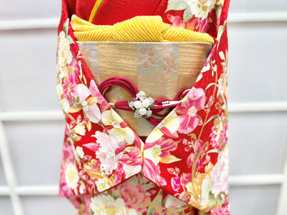 帯には少し落ち着いたゴールドのものを使用しました。ゴールドの帯は品があり、全体をしっかりと引き締めてくれる役割がありますね。