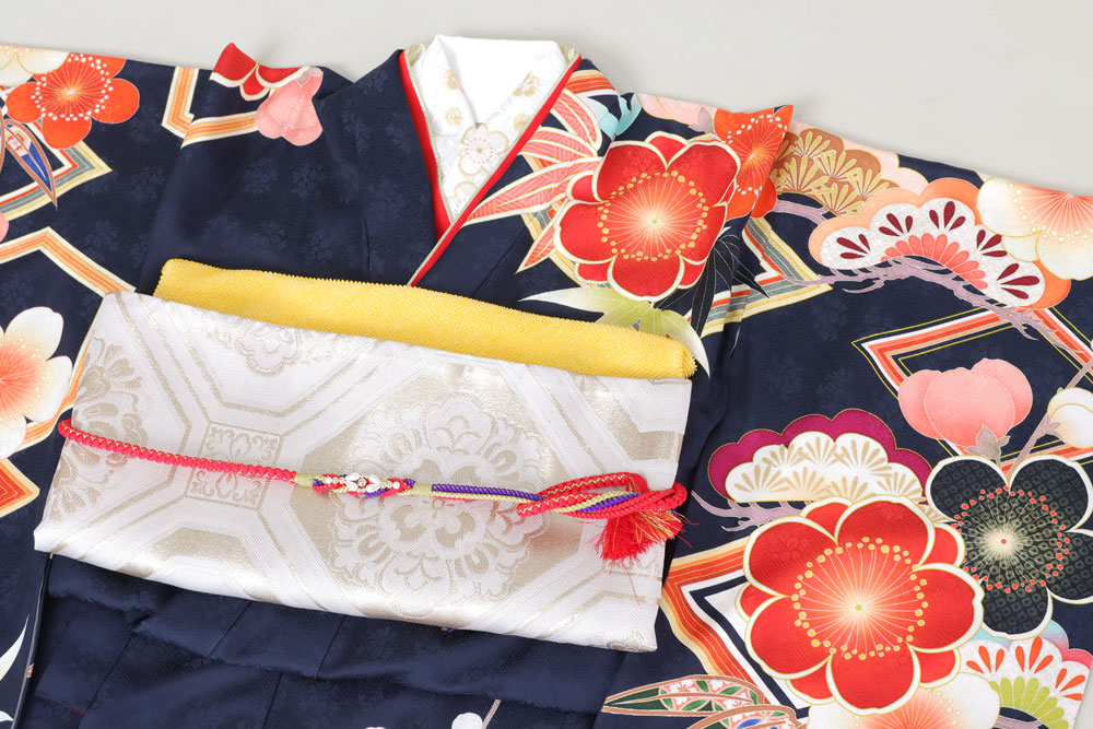 黒やグレー、シルバーといったモノトーンの帯を選ぶと、ぐっとクールでスタイリッシュな印象になります。帯締めには、振袖の色と同系色の濃い紺色や、アクセントになるような鮮やかなブルーを持ってくるのも素敵です。メタリックな質感の帯締めも、モダンな雰囲気を演出してくれます。