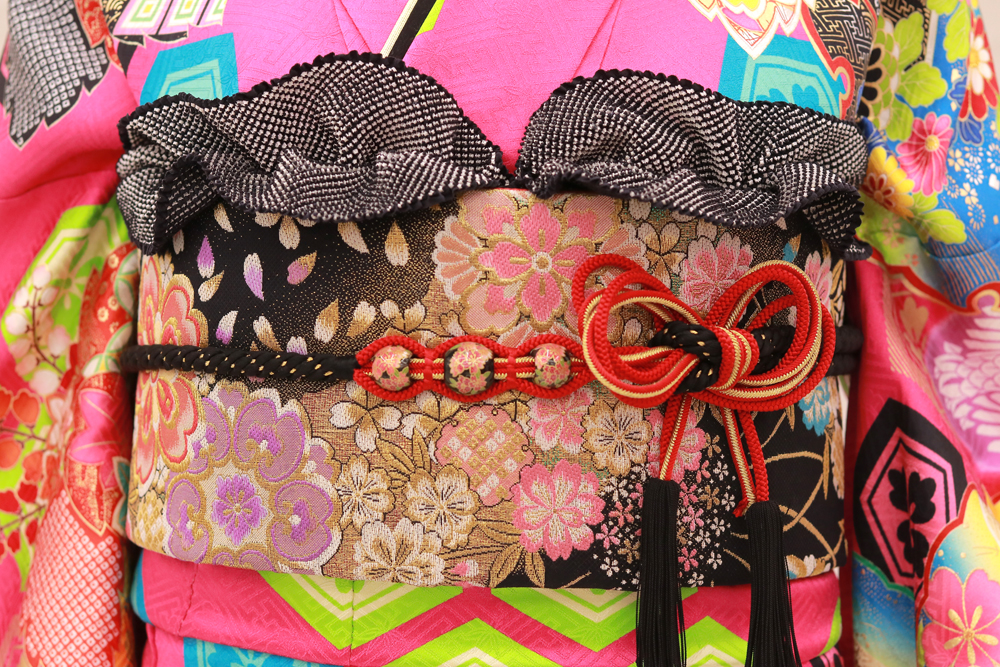 今回は、振袖のインパクトに負けてしまわないよう、黒を基調とした帯で引き締め効果を出しています!!