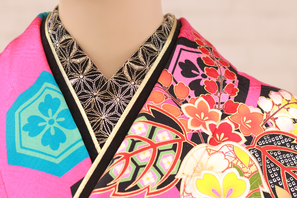 また、重ね襟(かさねえり)も同様に黒を入れ、ビビットカラーのピンクに負けないようしっかりと色を入れています!