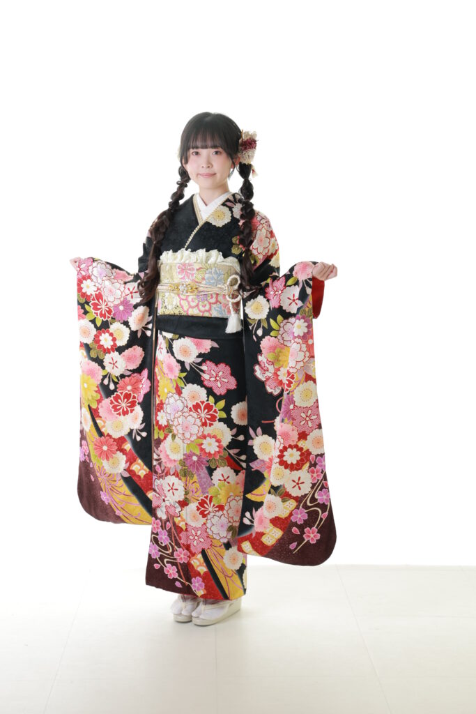 近年人気な黒色振袖。格式高く落ち着いた雰囲気があるので、成人式という特別な場にふさわしい装いになります。