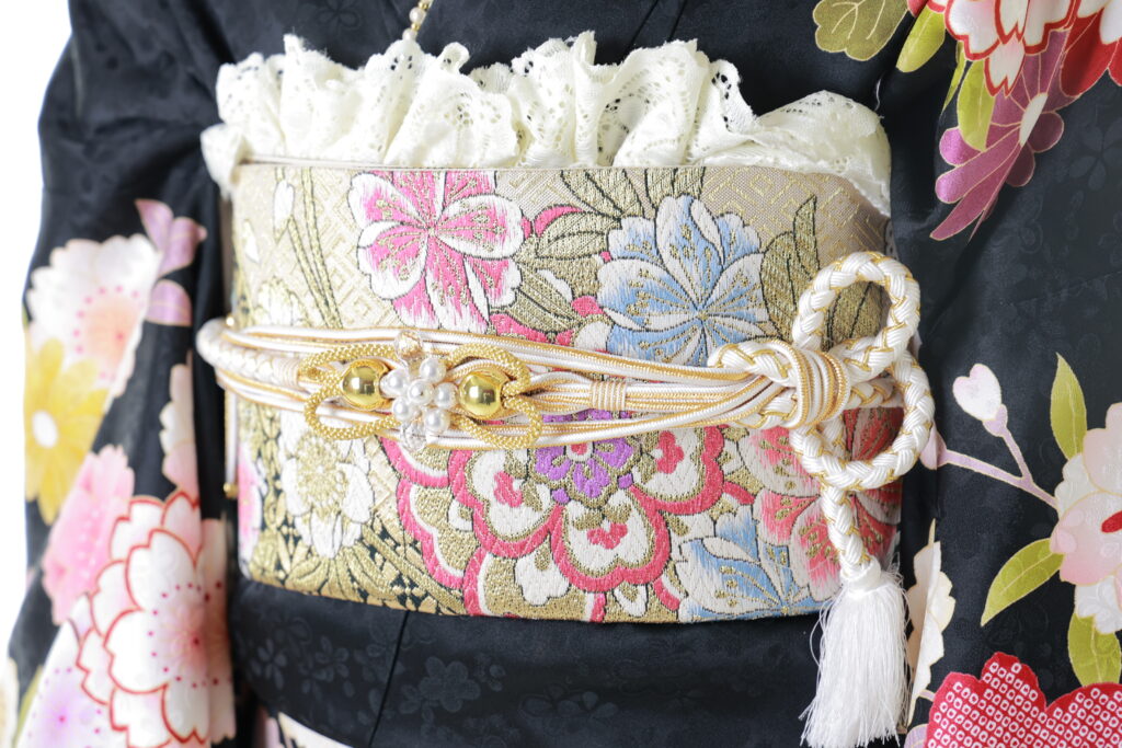 ✅袋帯…淡い金色をベースに、ピンクや白の柄が入っており、振袖全体の優しい雰囲気に調和します。