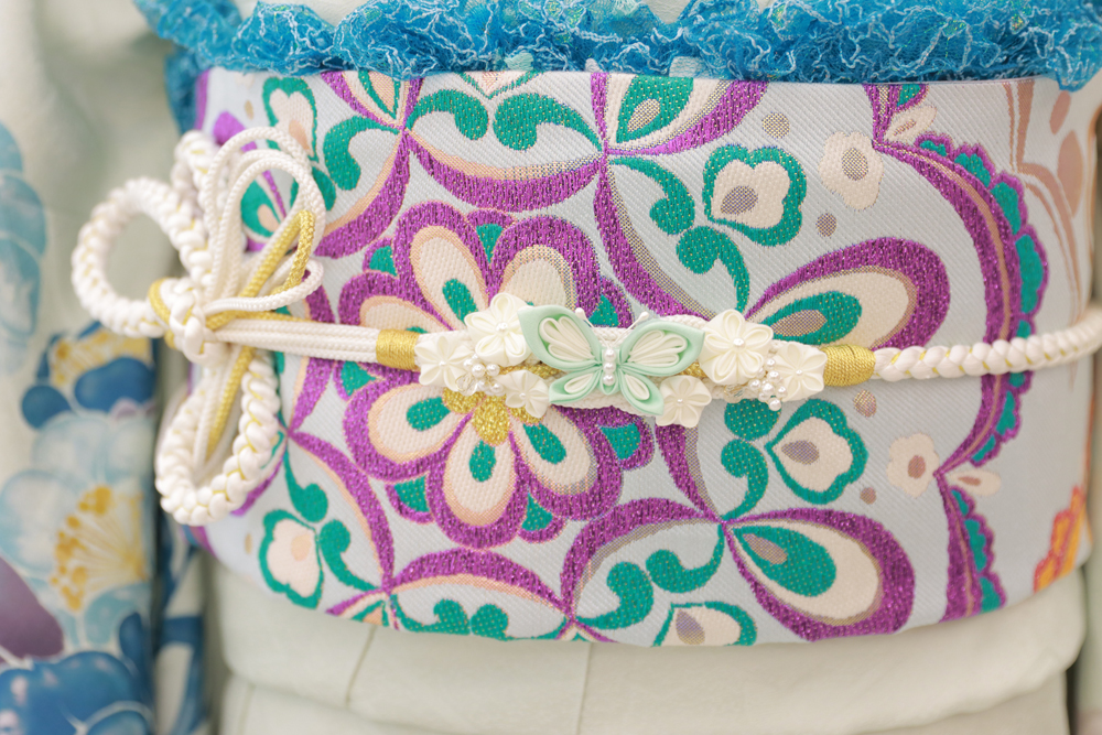 帯締め(おびじめ)は、全体の色のバランスをみて白で明るく華やかに見えるよう組み合わせてみました!