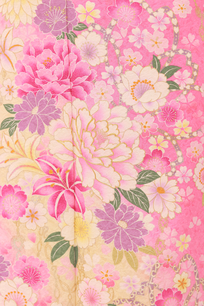 今回、ご紹介させていただくこのビビットピンク振袖には『牡丹(ぼたん)』と『桜(さくら)』の柄が入っています!
