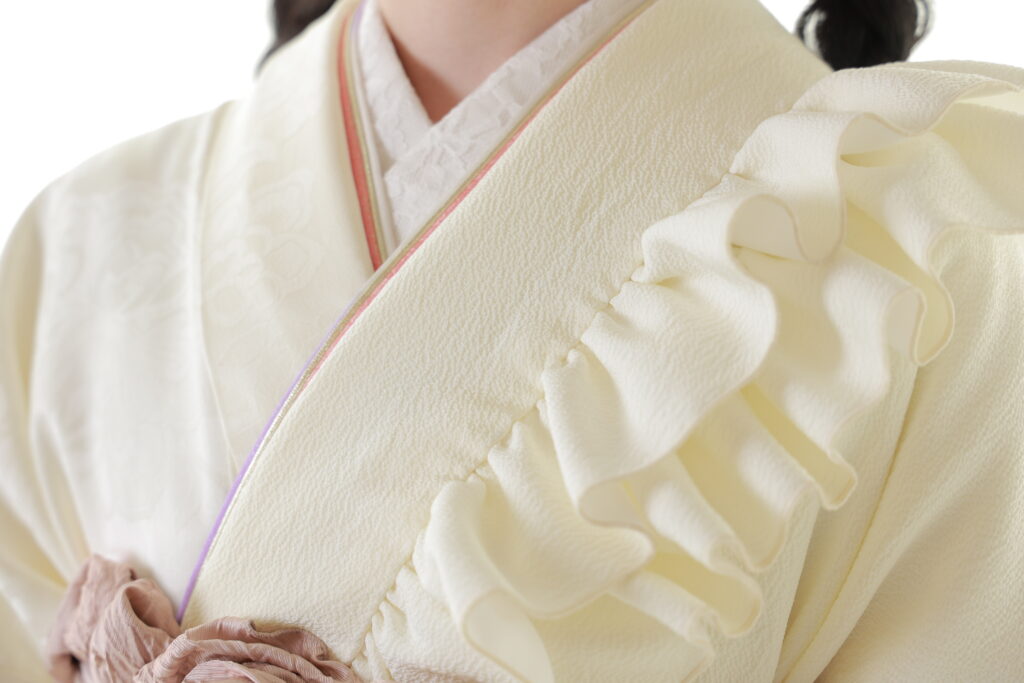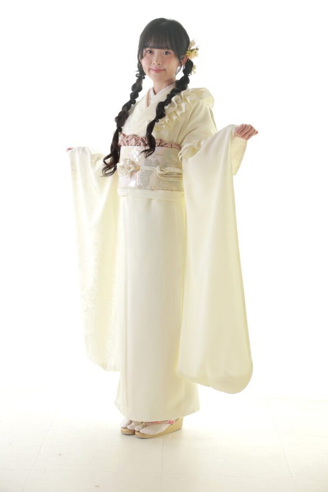 振袖の持つ優雅で格式高い雰囲気を保ちつつ、フリルという現代的な装飾を加えることで、よりファッショナブルで可愛らしい印象を与えてくれる白振袖です!