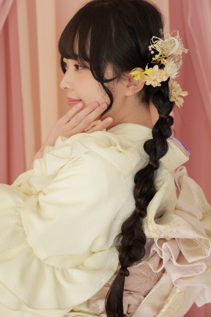 編みおろしにすることで、動きのある軽やかな印象を与え、重たくなりがちな和装ヘアに抜け感をプラスします。さらに、このヘアスタイルは、振袖のフリルや帯締めの「ふわふわ感」とも相性抜群で、全体として統一された「夢見るような可愛らしさ」を演出してくれるのです。