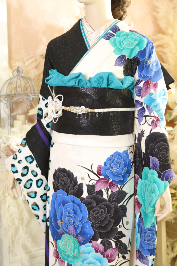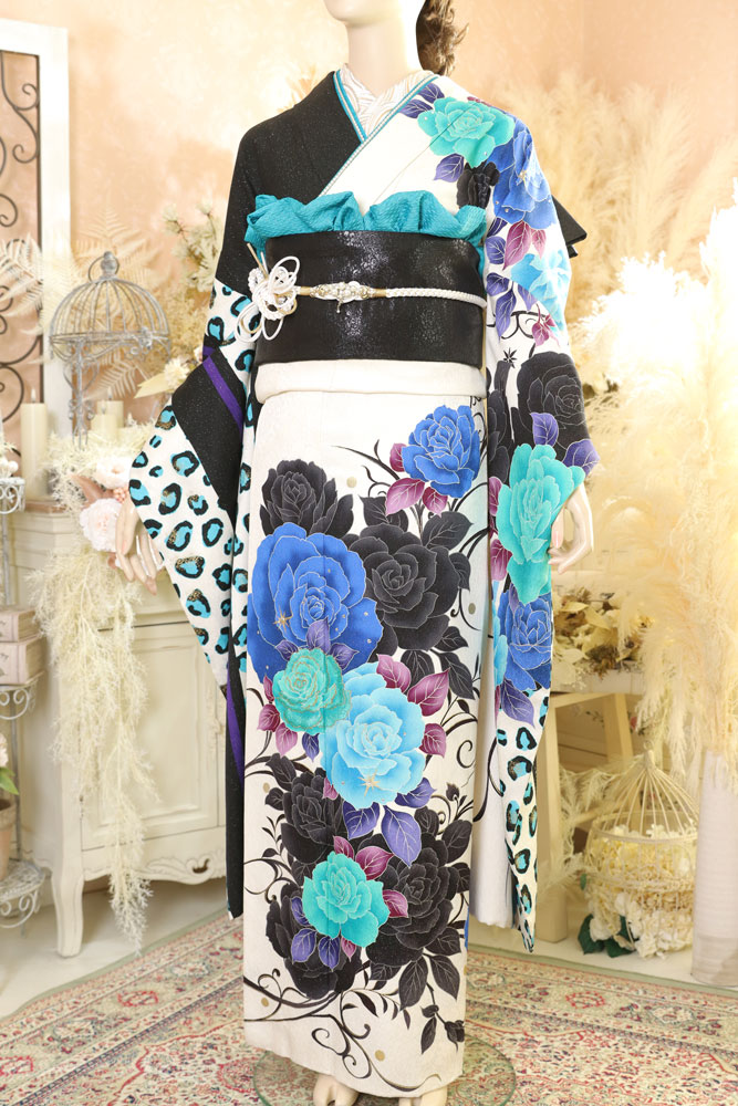 こちらの振袖は、白地に青色や黒色の薔薇柄やヒョウ柄があしらわれたモダンなものです。
